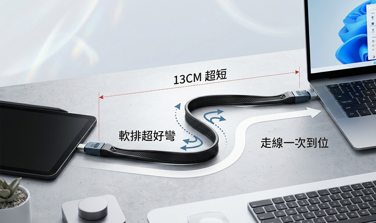 這條線採用「軟排線」設計,比起一般的編織線或塑膠線更具韌性且柔軟。13cm 的黃金長度,最適合搭配行動電源、掛在包包上,或是連接桌面上的 SSD 外接盒,讓桌面不再亂糟糟。