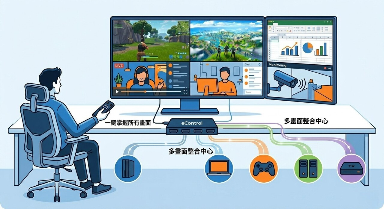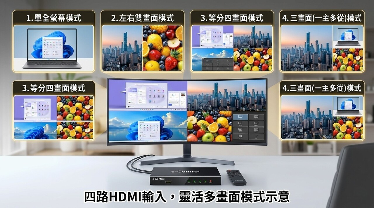 而是「HDMI畫面分割器多畫面整合中心」,一台搞定多設備畫面。