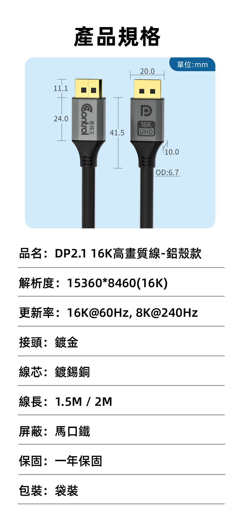 【易控王】1.5M~2M DP2.1 16K 鋁合金傳輸線 動態HDR 鍍金接頭 (30-392-01)
