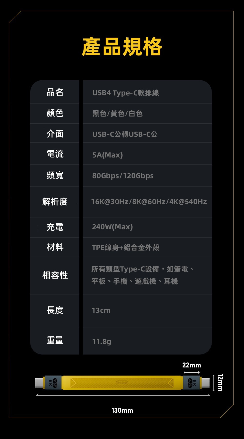 【易控王】13cm USB4 Type-C軟排線 240W快充 80GBps 16K/8K(30-782-01)