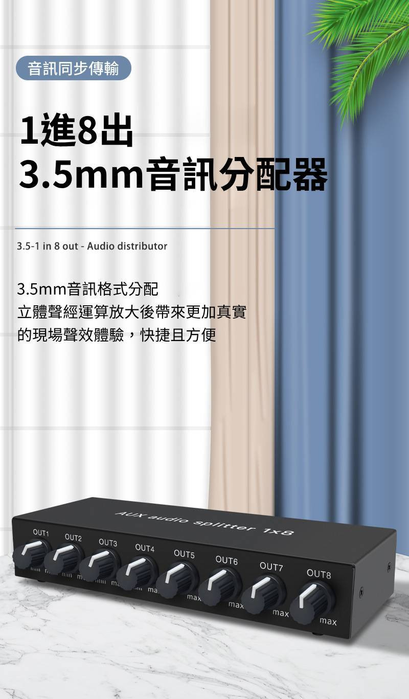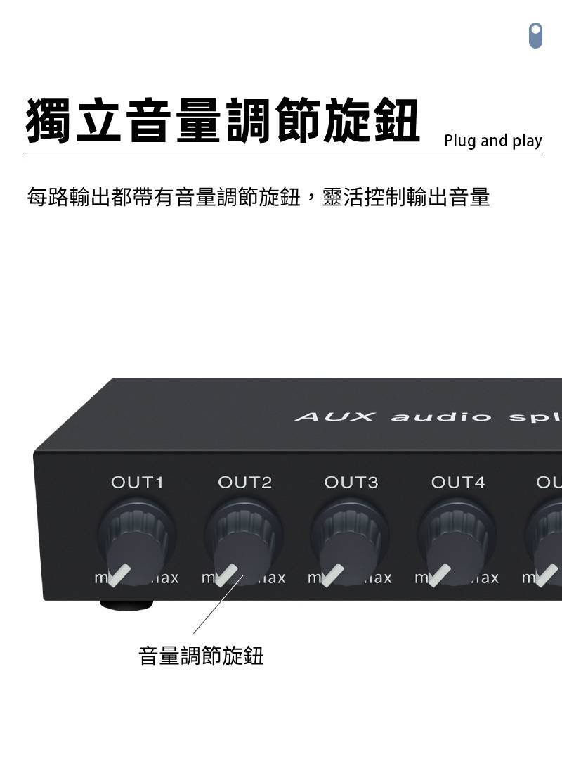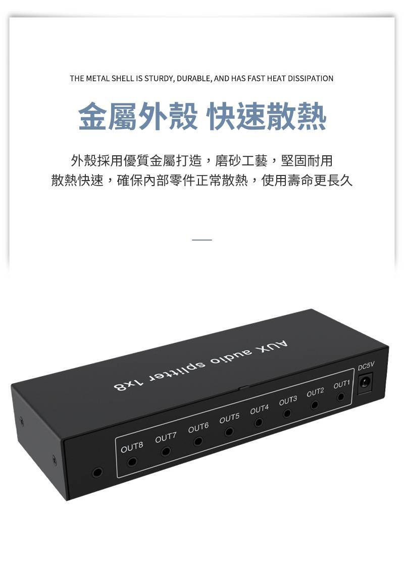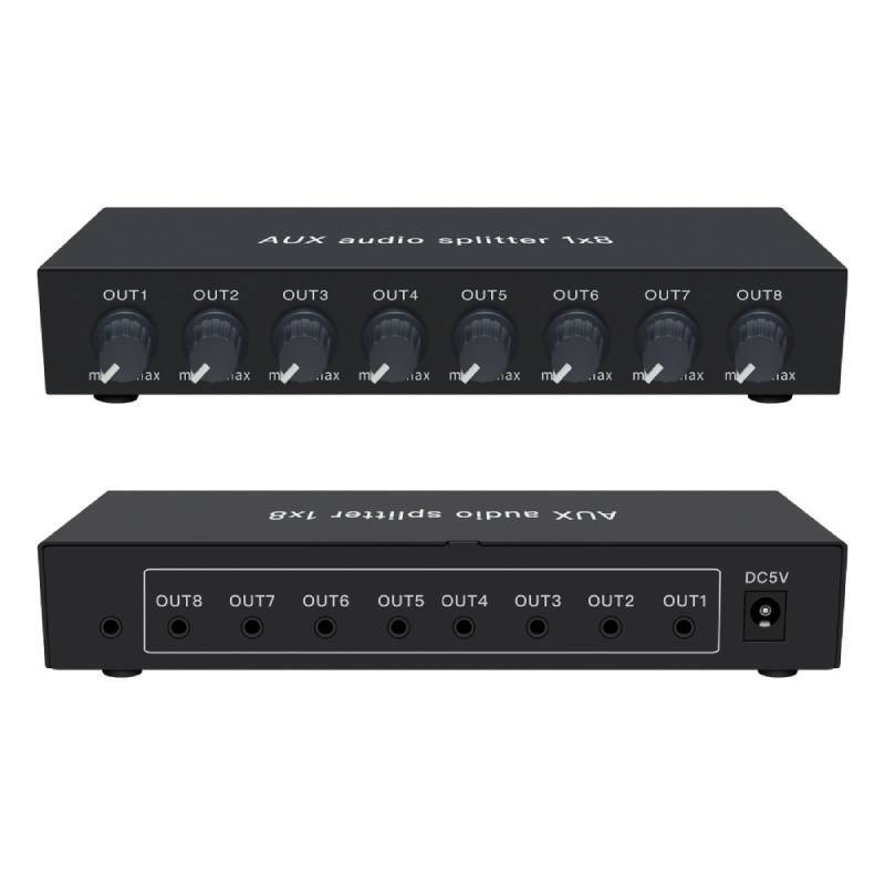 【易控王】1x8 一進八出3.5mm音訊分配器 帶音量調節 獨立供電 金屬外殼 即插即用 (40-065-02)