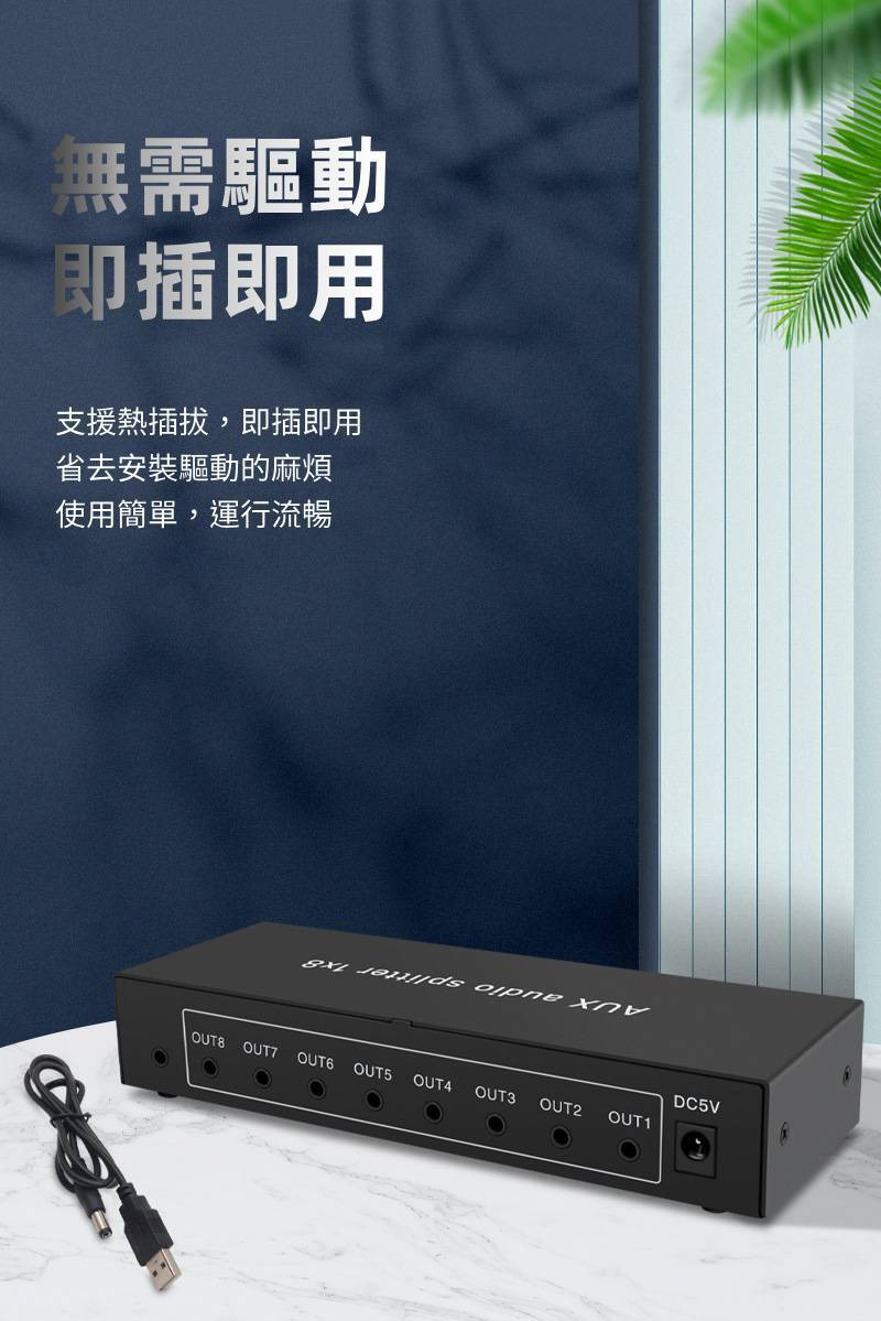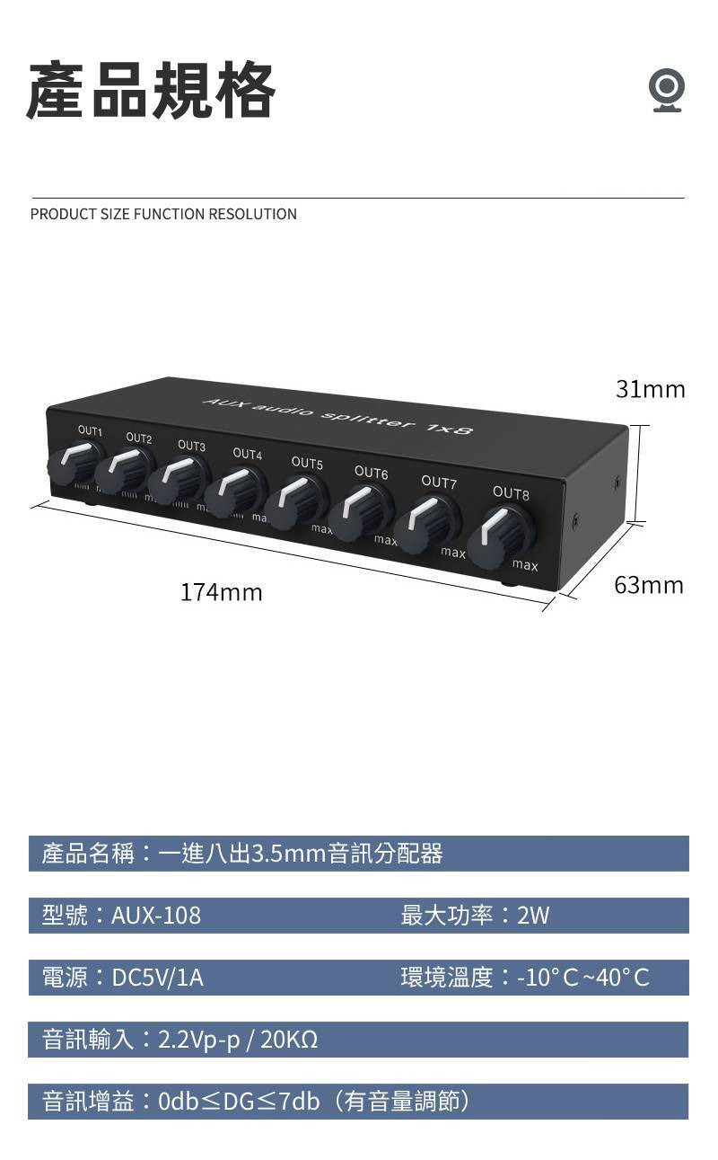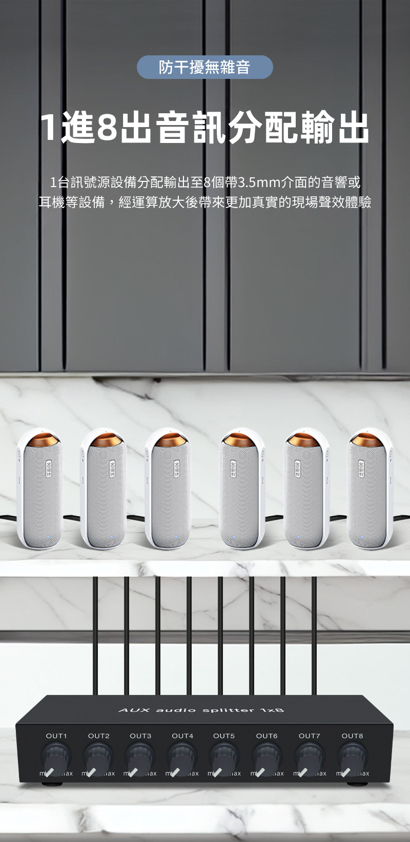 【易控王】1x8 一進八出3.5mm音訊分配器 帶音量調節 獨立供電 金屬外殼 即插即用 (40-065-02)