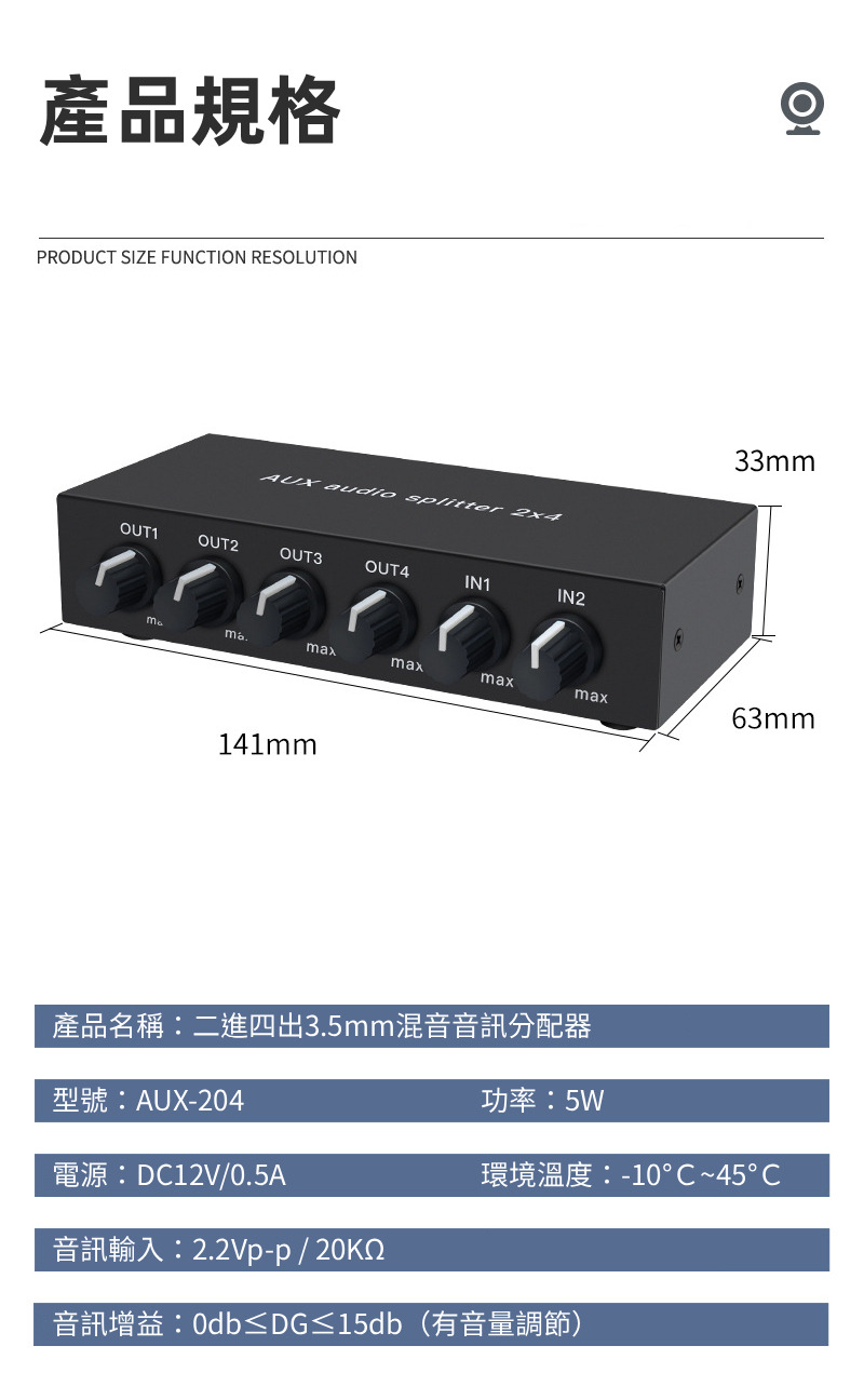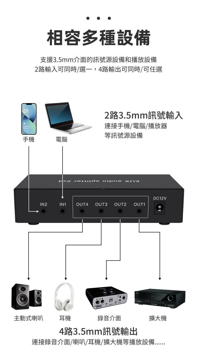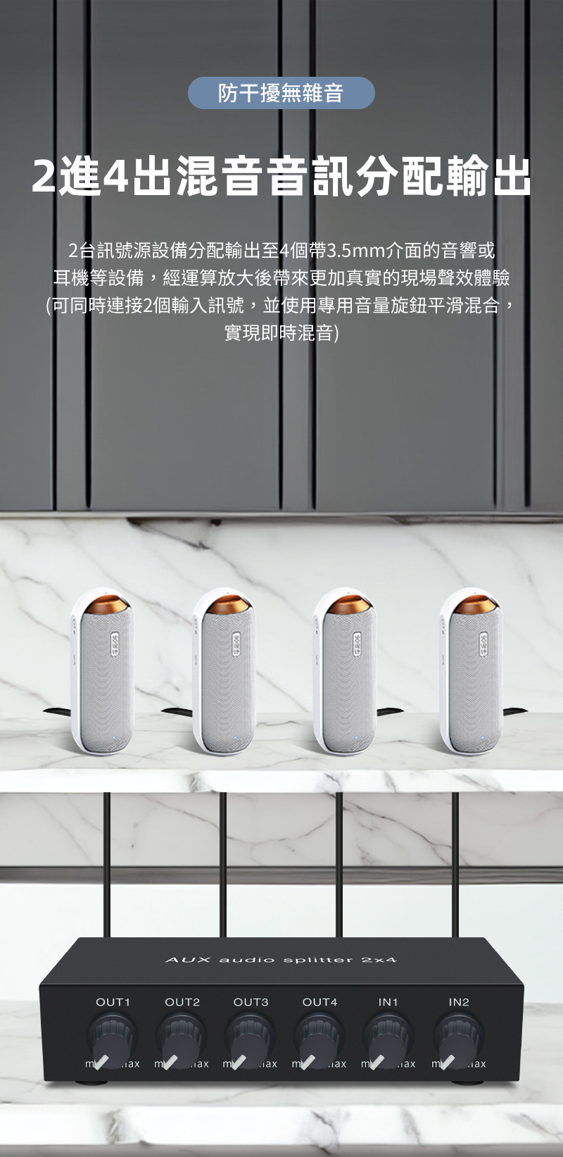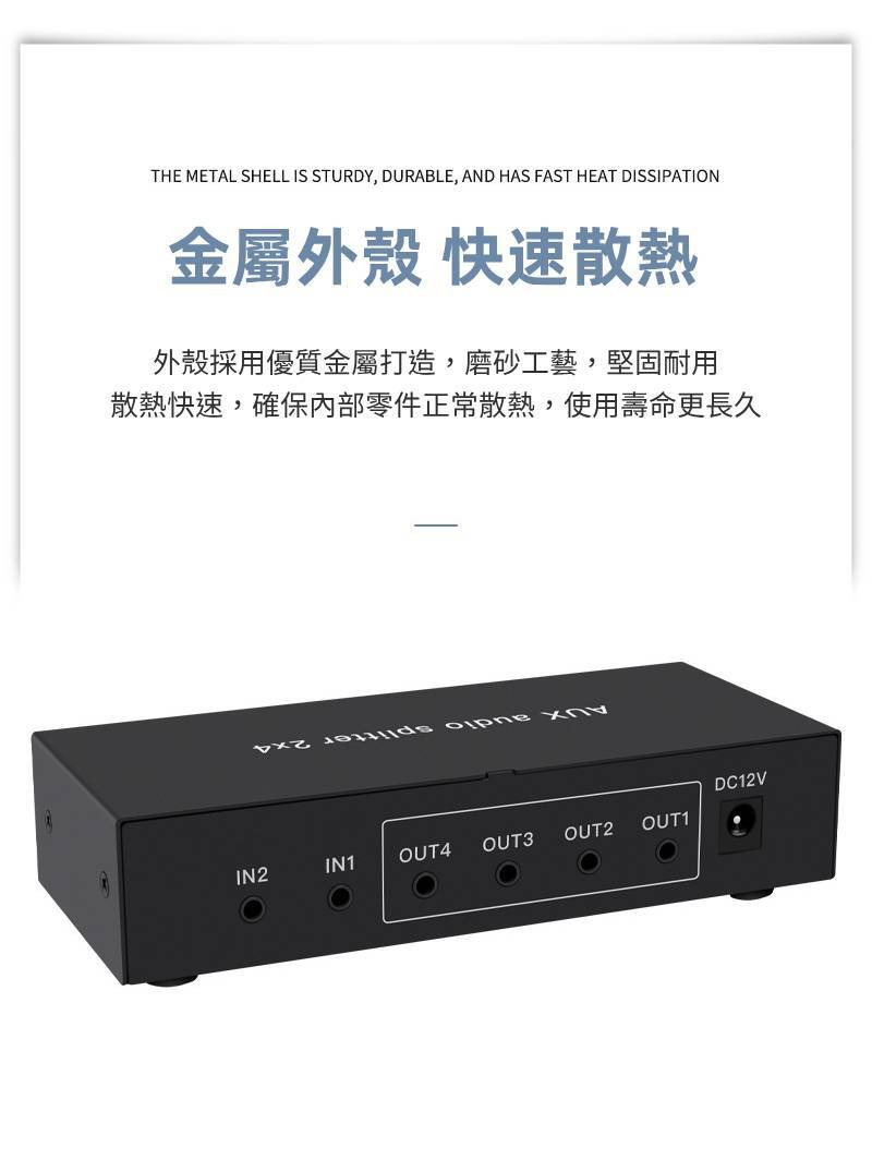 【易控王】2x4 二進四出3.5mm混音音訊分配器 帶音量調節 獨立供電 金屬外殼 即插即用 (40-065-03)