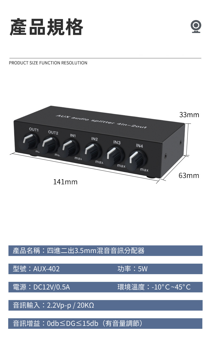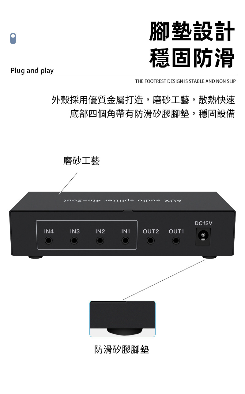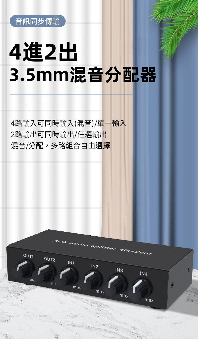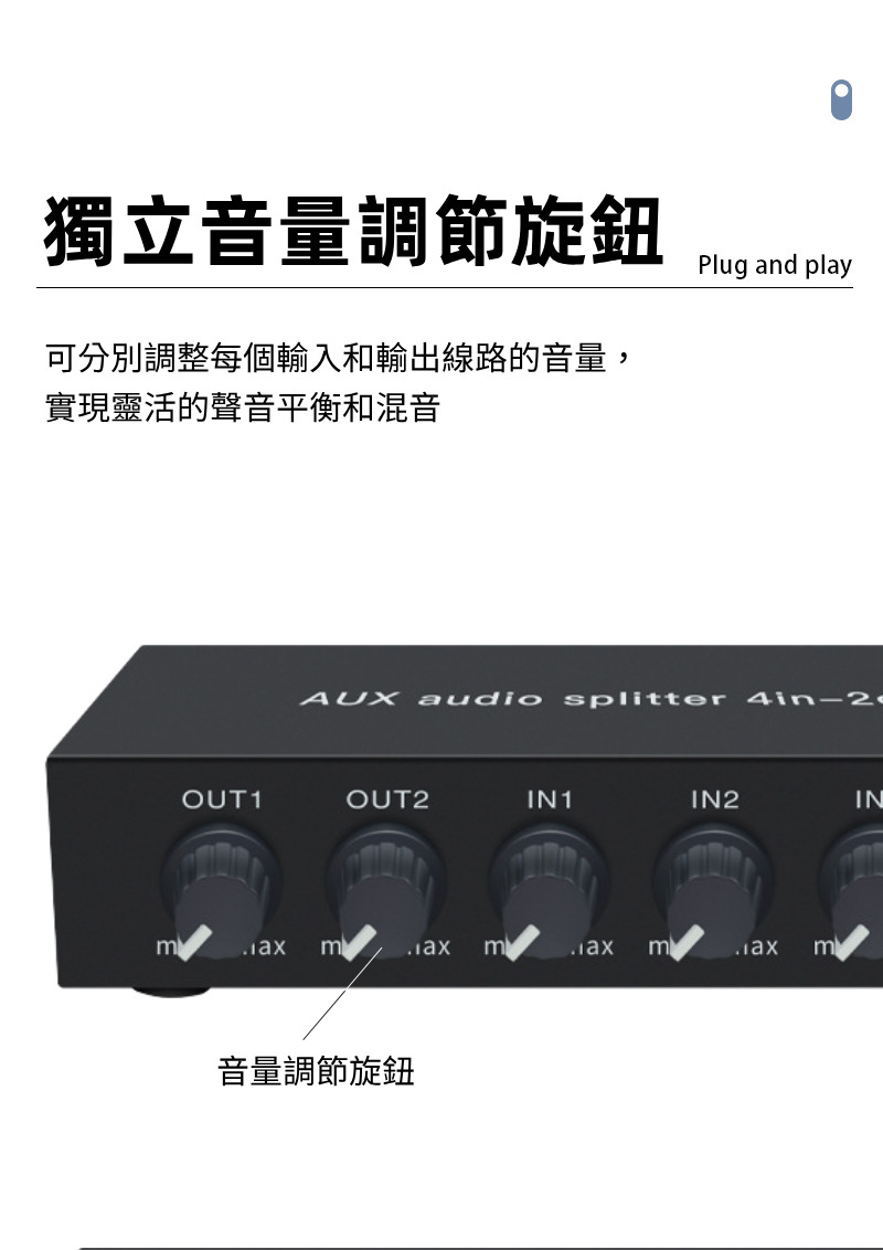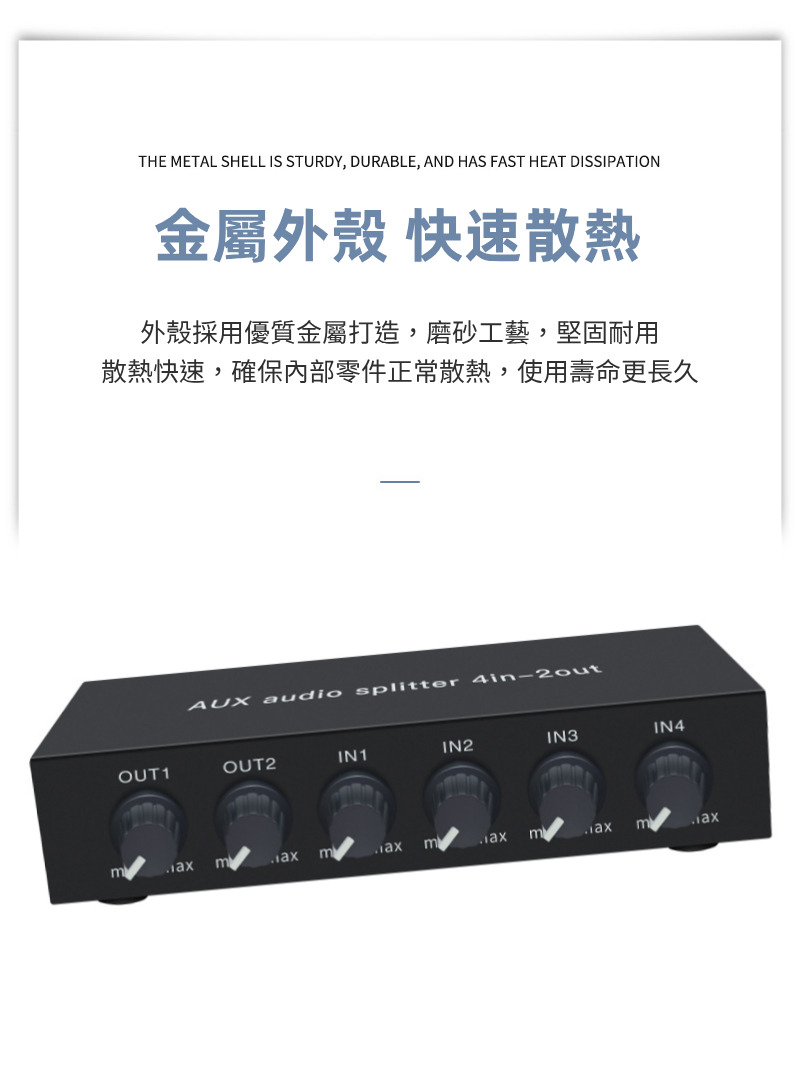 【易控王】4x2 四進二出3.5mm混音音訊分配器 帶音量調節 獨立供電 金屬外殼 即插即用 (40-065-04)