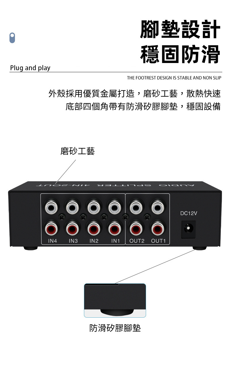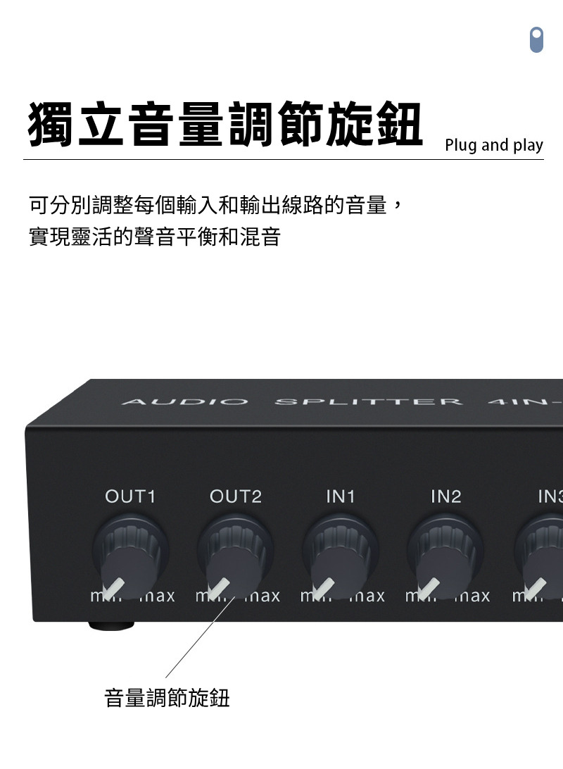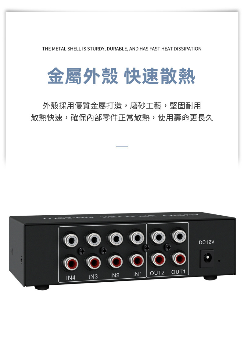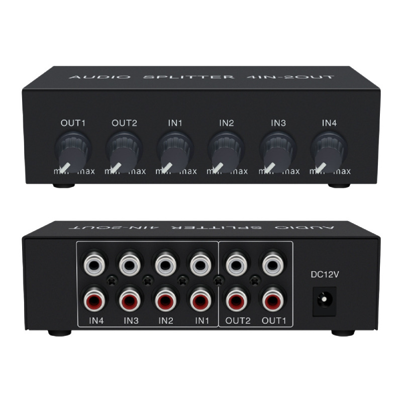 【易控王】4x2 四進二出RCA混音音訊分配器 帶音量調節 獨立供電 金屬外殼 即插即用 (40-065-06)