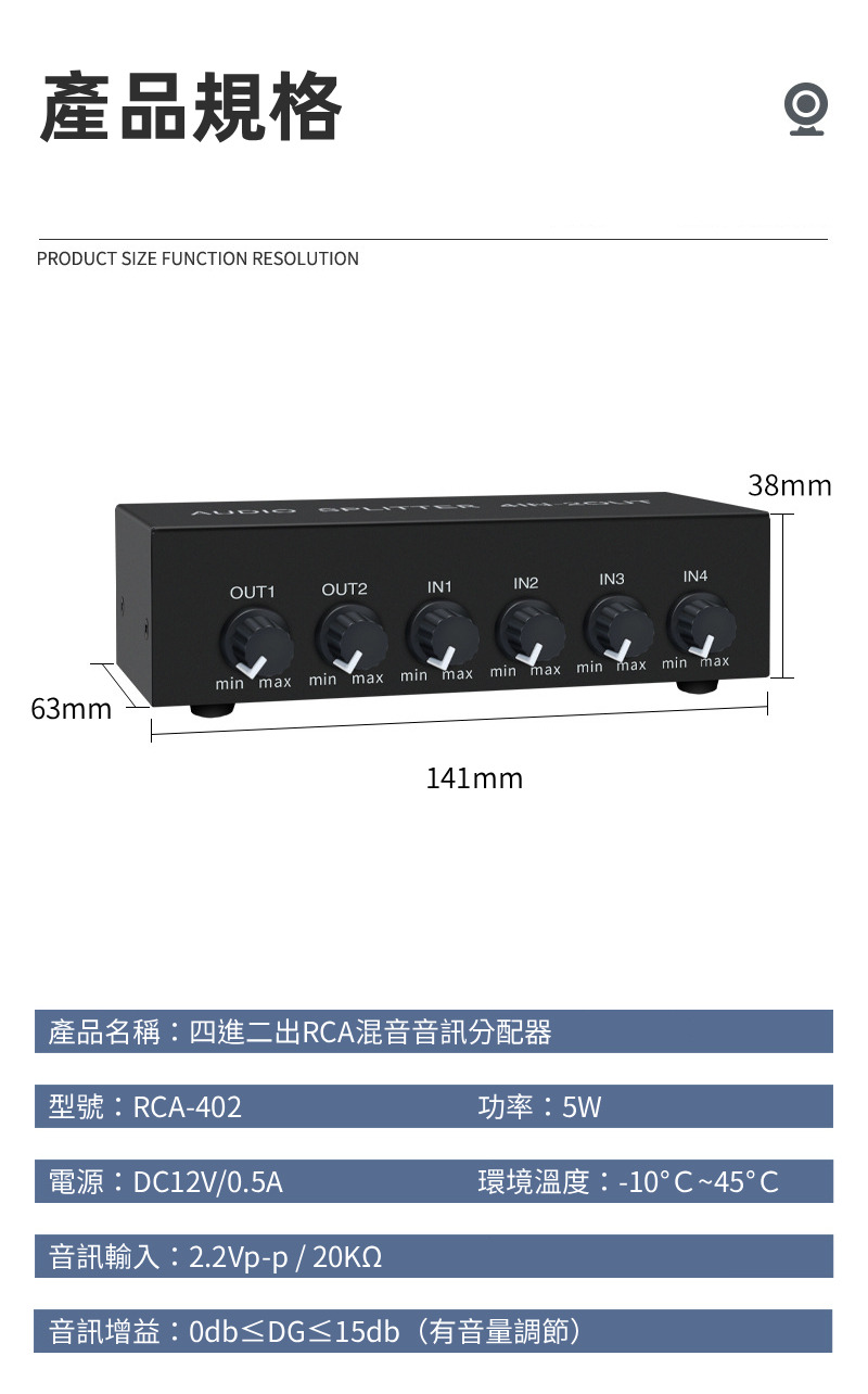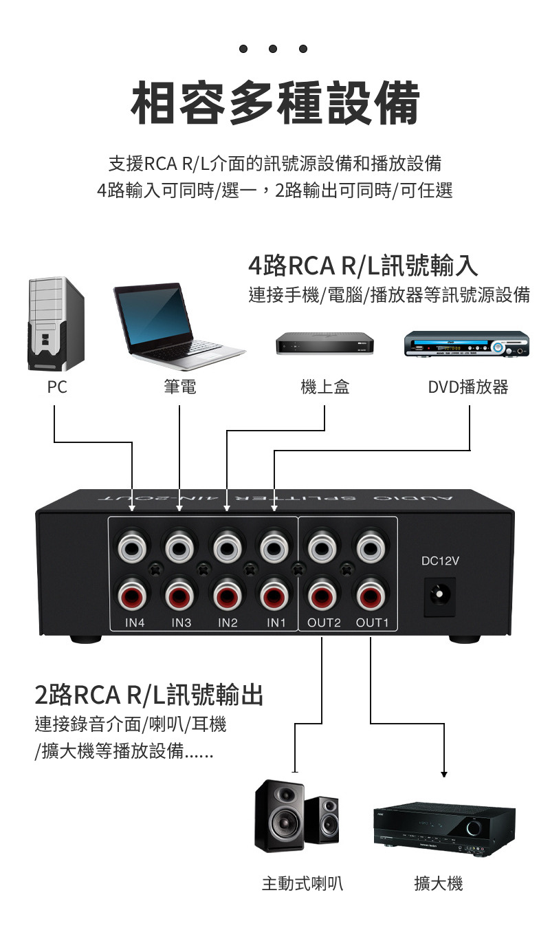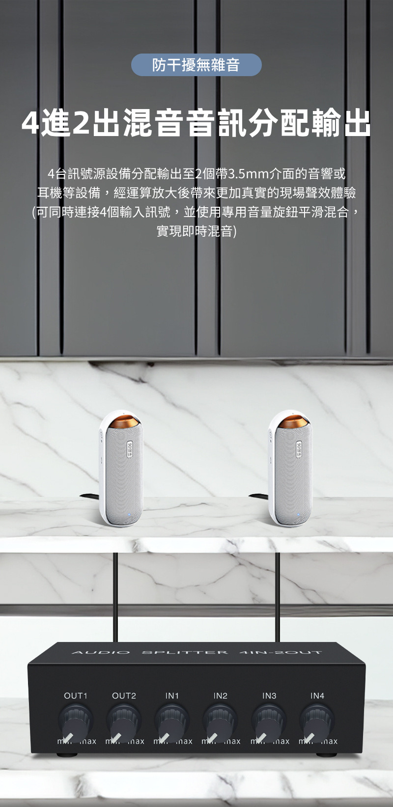 【易控王】4x2 四進二出RCA混音音訊分配器 帶音量調節 獨立供電 金屬外殼 即插即用 (40-065-06)