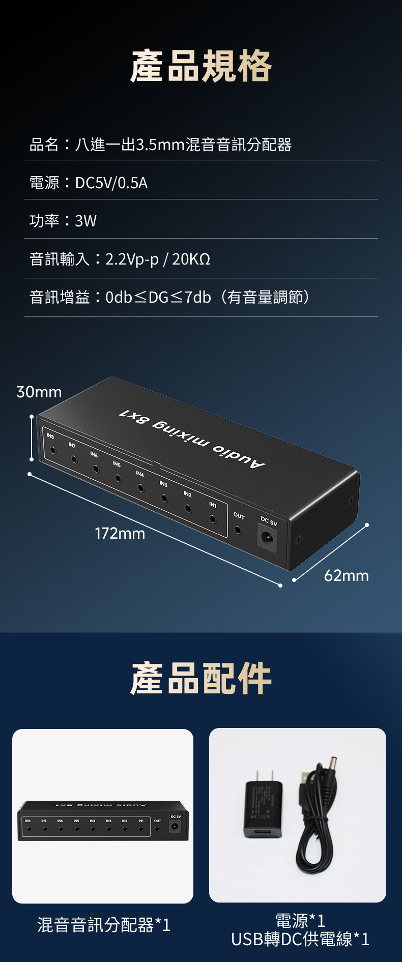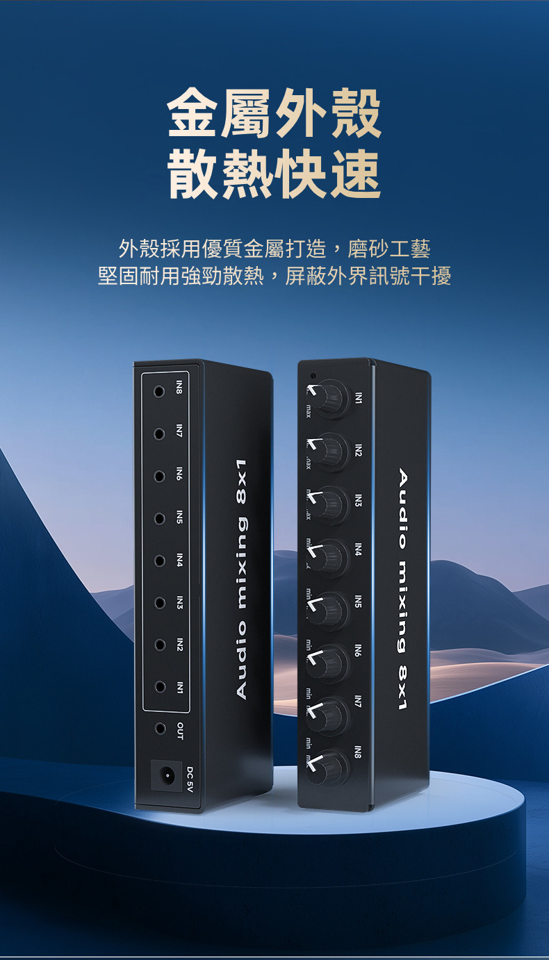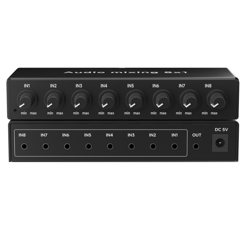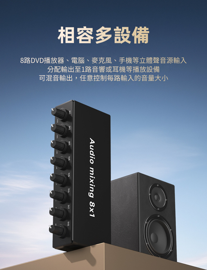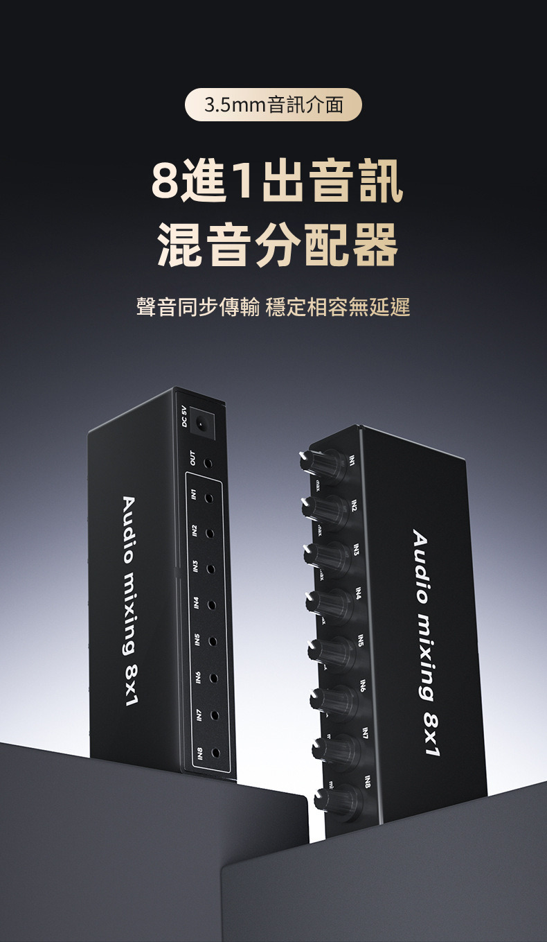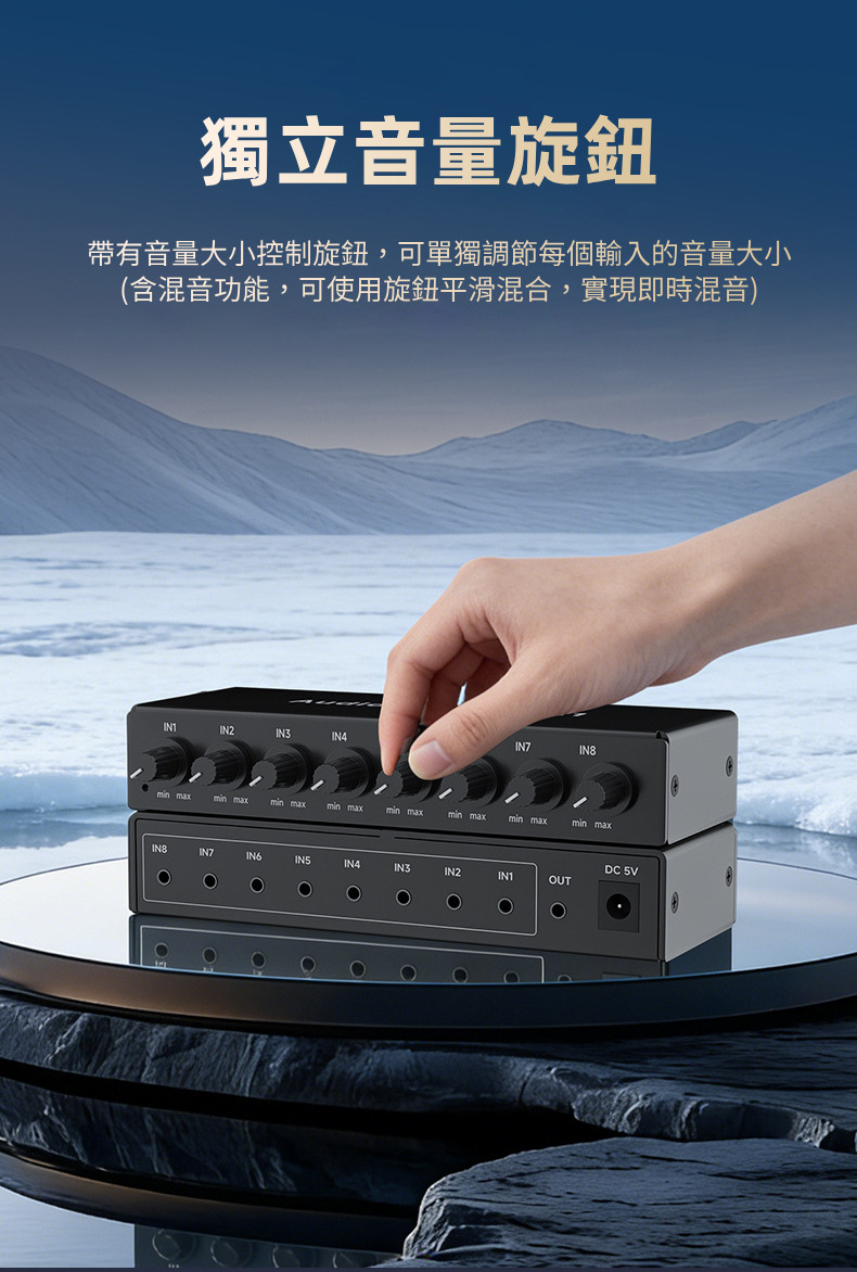 【易控王】8x1 八進一出3.5mm混音音訊切換器 含音量調節 獨立供電 金屬外殼 即插即用 (40-065-08)