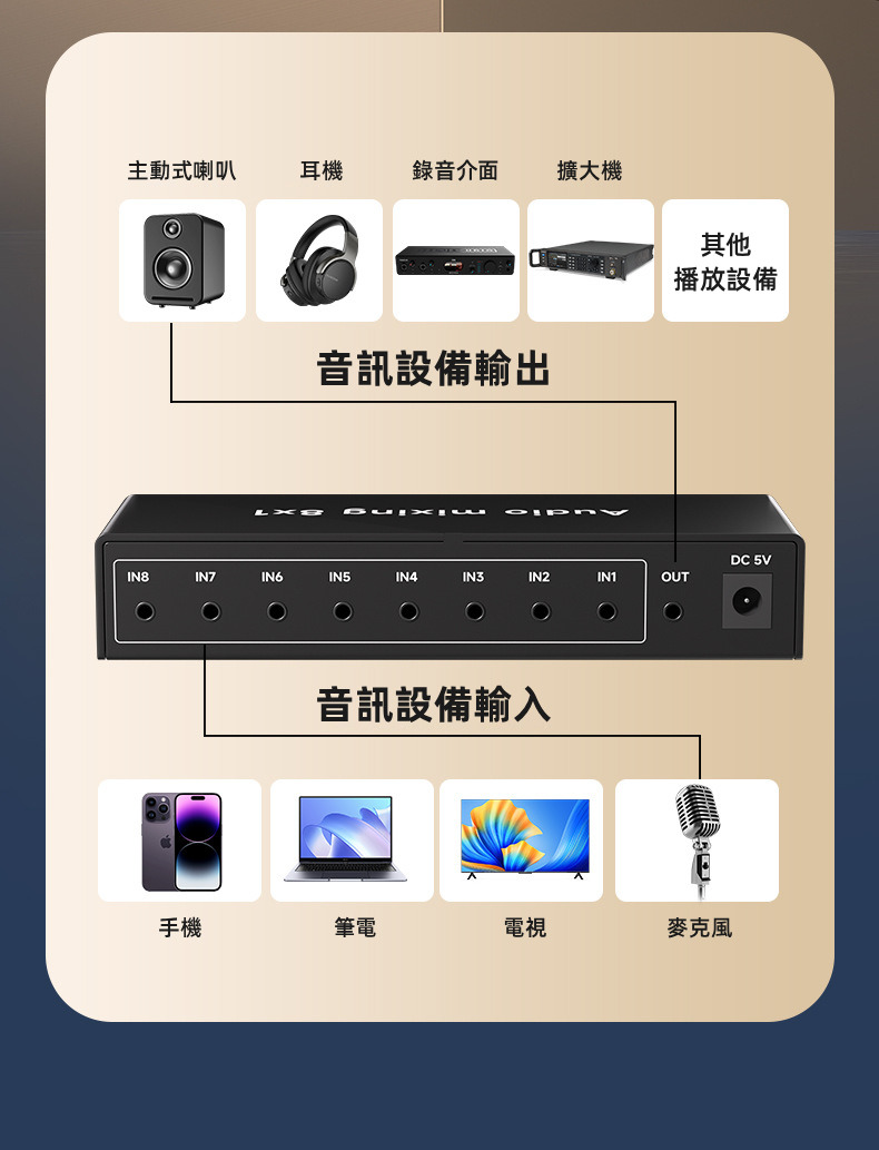 🎛️ 8路強大輸入: 最多連接 8 台設備,免除頻繁插拔,工作效率倍增
