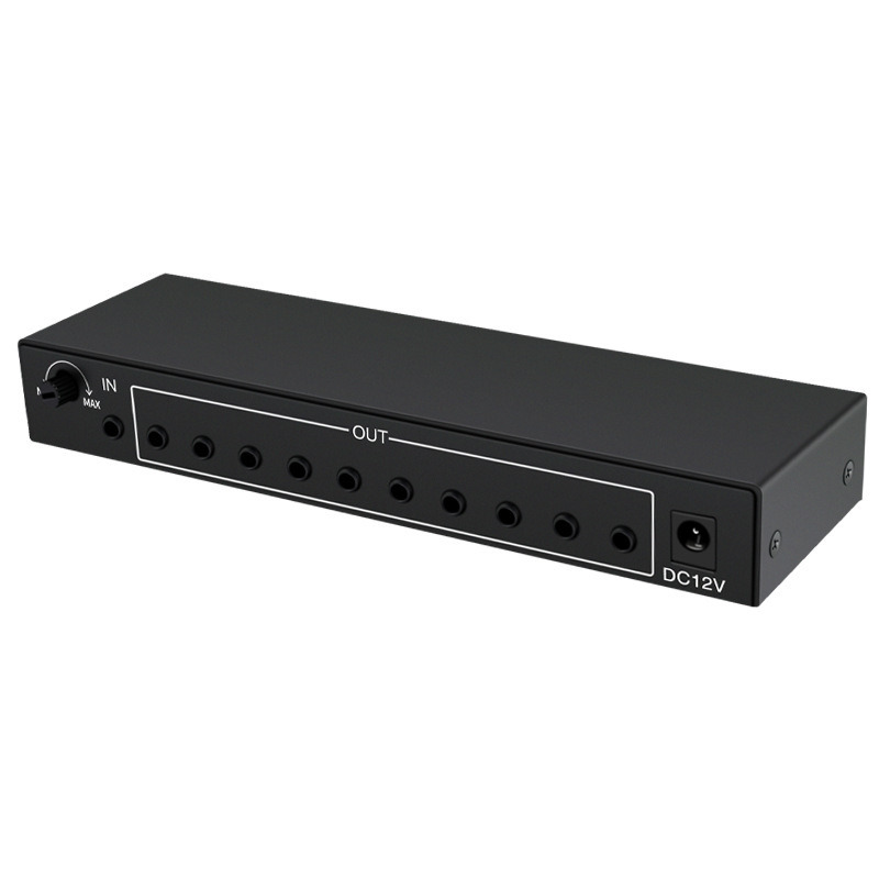 【易控王】1x10 一進十出3.5mm音訊分配器 含音量調節 獨立供電 金屬外殼 即插即用 (40-065-09)