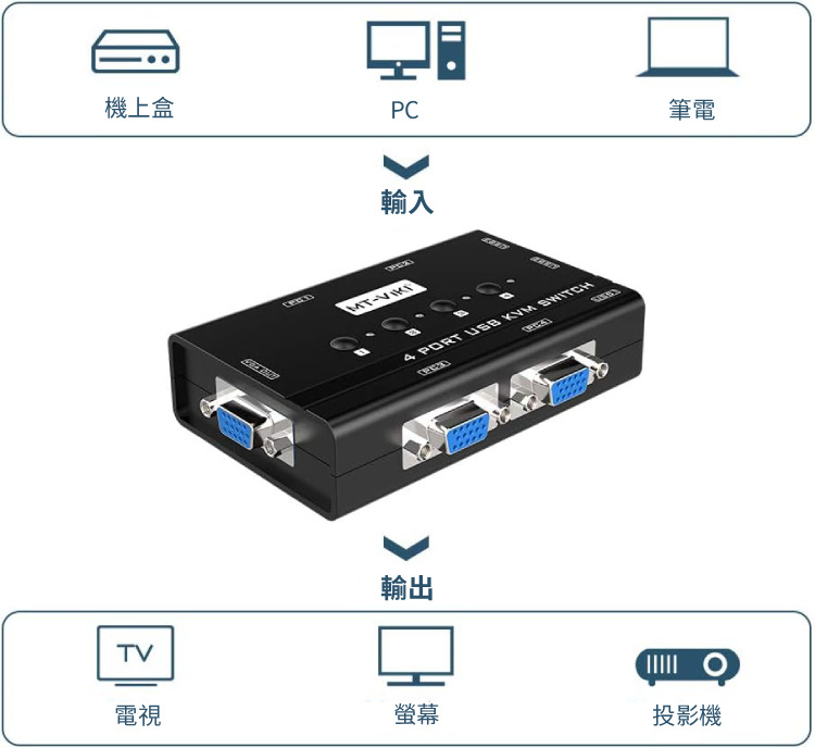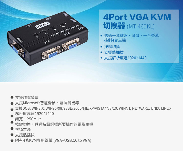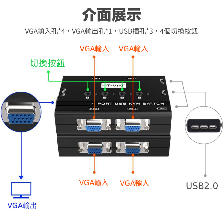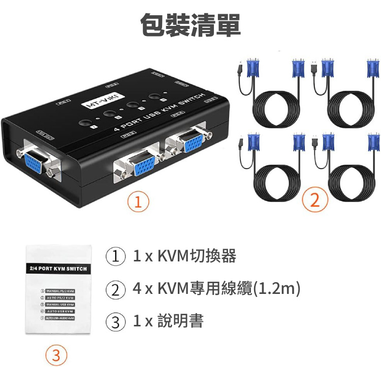 【易控王】4 PORT VGA KVM 切換器 USB設備共享 附四條切換線(40-104)