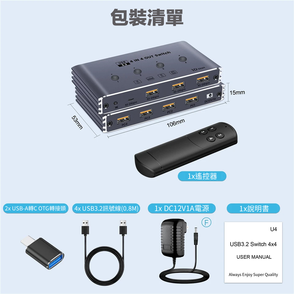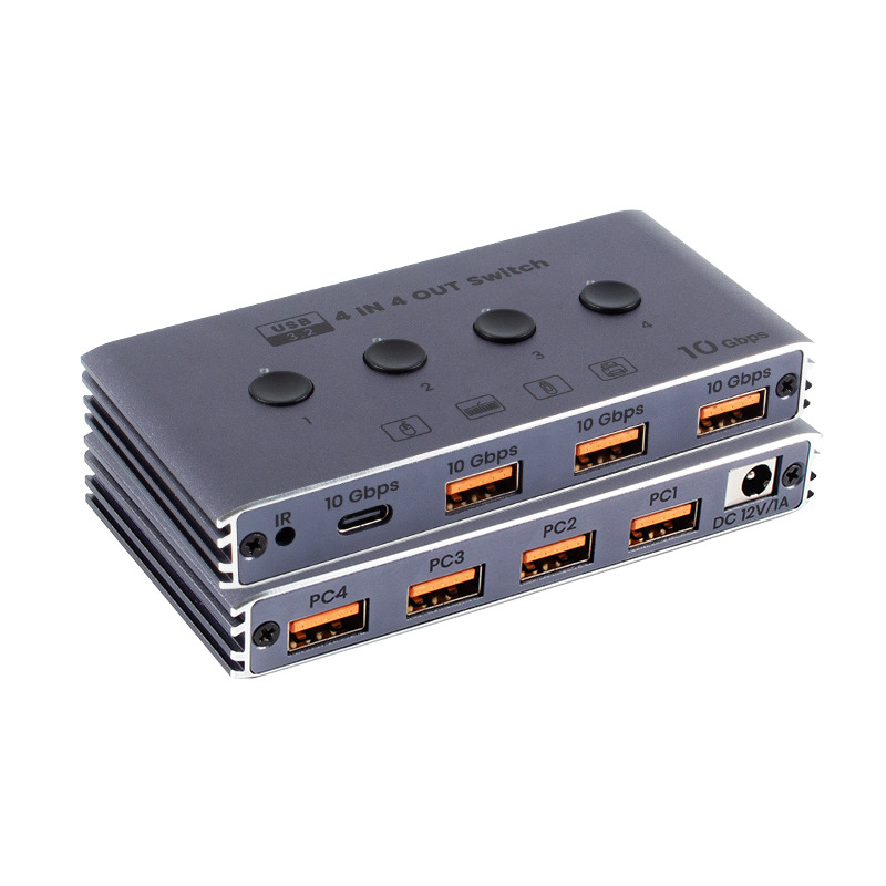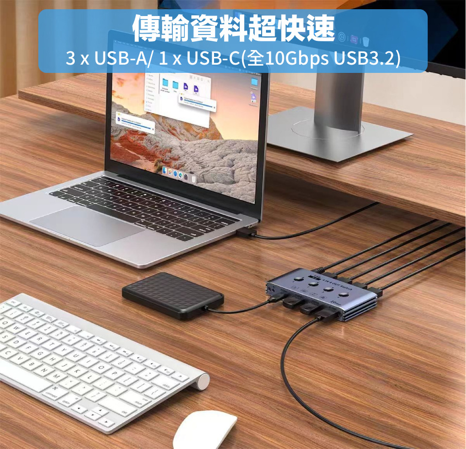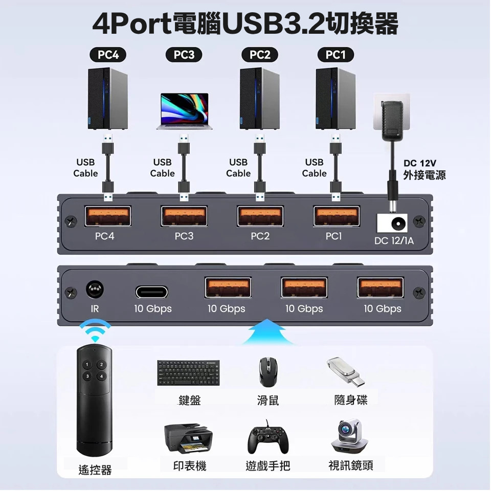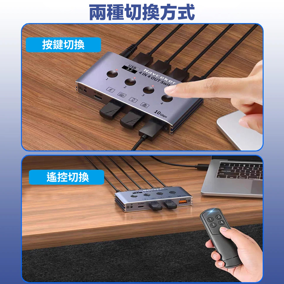 【易控王】4進4出 USB3.2共享器(3A 1C) 10Gbps 鋁合金外殼 遠端遙控(40-122-09)